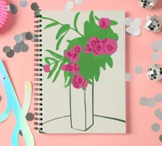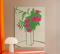 Un vaso con una vegetazione lussureggiante e fiori rosa vivaci è raffigurato su uno sfondo chiaro. I tratti sono ampi ed espressivi e conferiscono alla composizione un'atmosfera giocosa e astratta.