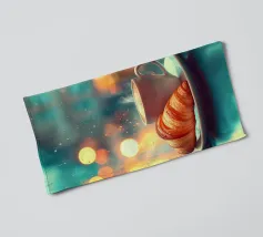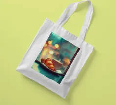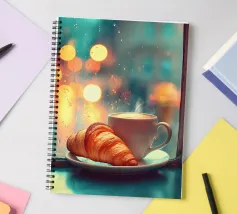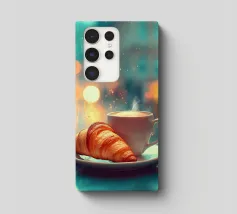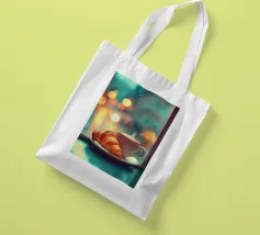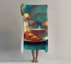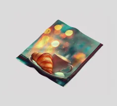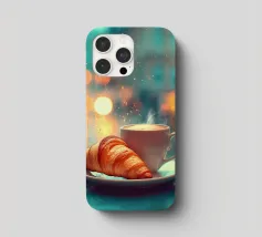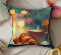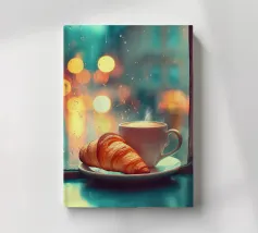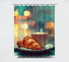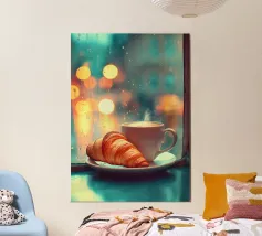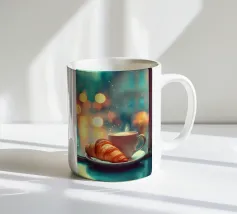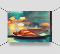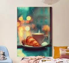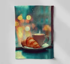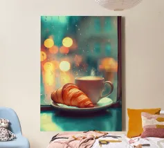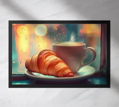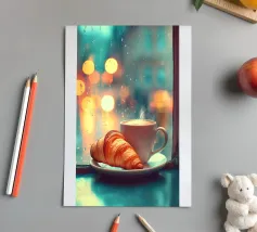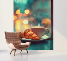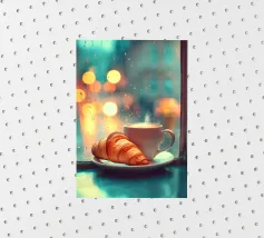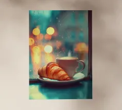 Questa immagine d'atmosfera cattura la magia di una tranquilla mattinata sotto la pioggia. Un croissant appena sfornato giace su un piatto accanto a una tazza di caffè fumante, mentre lievi gocce scorrono sul vetro della finestra. Le luci sfocate della città sullo sfondo creano un bokeh caldo che si fonde armoniosamente con i toni turchesi della finestra. La scena trasmette un senso di sicurezza, divertimento e la magia di un momento accogliente della vita quotidiana. Particolarmente interessante per gli intenditori, gli amanti del caffè o come decorazione in bar, cucine o angoli di lettura.