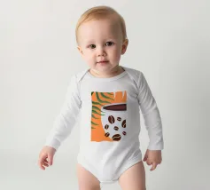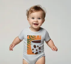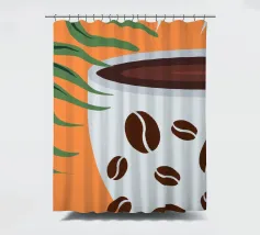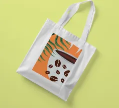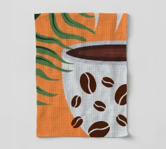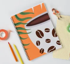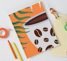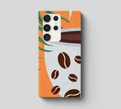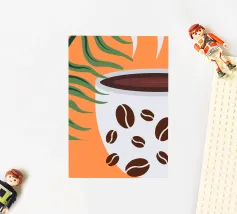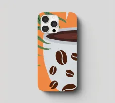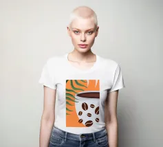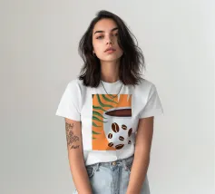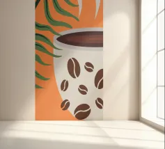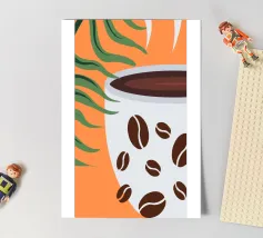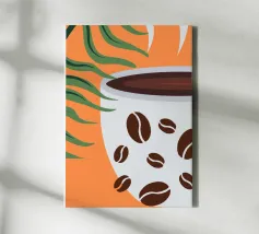 Una tazza di caffè fumante con chicchi di caffè che decorano la superficie. Le foglie verdi aggiungono un tocco di natura alla composizione.