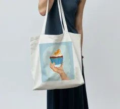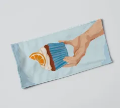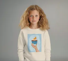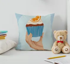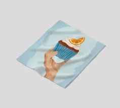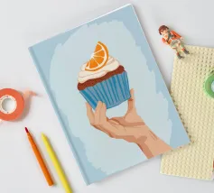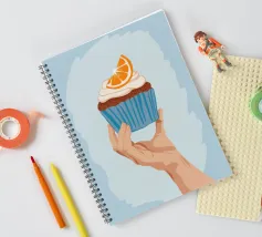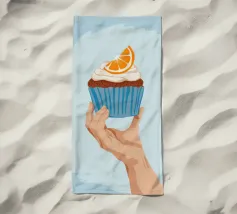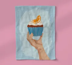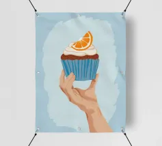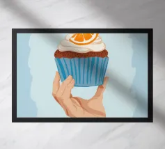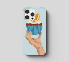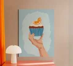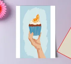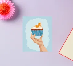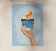 Una mano sorregge delicatamente un cupcake sormontato da una glassa bianca e da una singola fetta di arancia. L'illustrazione è una dolce e semplice celebrazione di un delizioso dolce da forno.