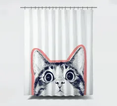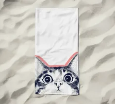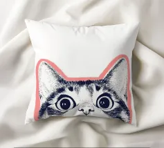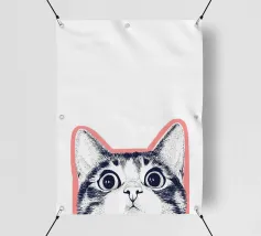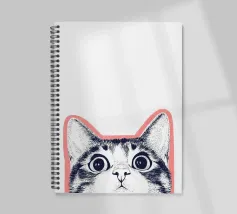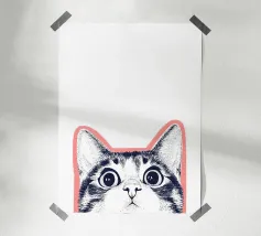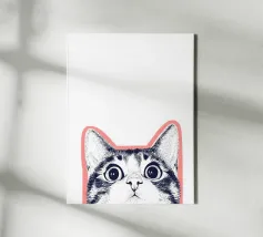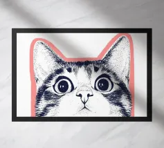 Questa divertente illustrazione mostra la mezza faccia di un gatto in un disegno rosa, bianco e nero su sfondo bianco. Gli occhi curiosi e le orecchie appuntite incarnano la natura giocosa degli animali domestici. Un'opera d'arte minimalista che cattura perfettamente l'amore felino!
