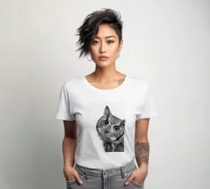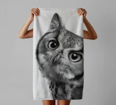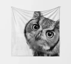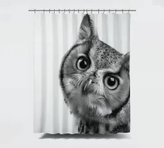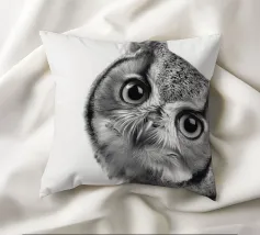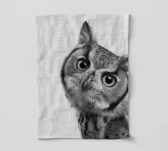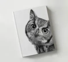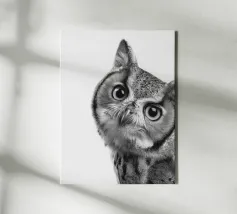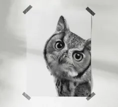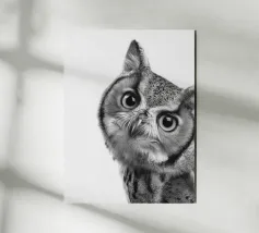 Un simpatico ritratto di un gufo che guarda curioso verso la fotocamera con grandi occhi e un'espressione divertita. Con le sue orecchie e il becco caratteristici, risplende in una foto realistica in bianco e nero su uno sfondo bianco, che mette in risalto le trame delle sue piume. Un affascinante pezzo di fauna selvatica che cattura la bellezza degli animali della foresta.