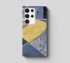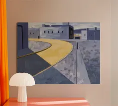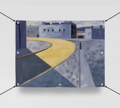 Un sentiero giallo brillante si snoda elegantemente attraverso un paesaggio minimalista di edifici grigi e squadrati. Il dipinto è uno studio sul contrasto dei colori e sulle forme geometriche pulite, che creano una scena urbana serena ma di grande impatto visivo.