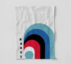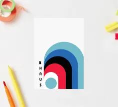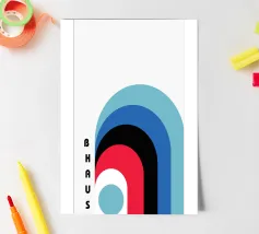 Questo poster astratto, ispirato al movimento Bauhaus, presenta una composizione dinamica di forme e archi curvi e stratificati, in colori sorprendenti come il rosso, il nero e vari blu. Il disegno include il testo verticale "BAUHAUS" sulla sinistra. Il gioco di forme sovrapposte crea profondità e interesse visivo, incarnando i principi Bauhaus di forma e colore. Prodotto come arte digitale di alta qualità a 7000x5000 pixel e 300 dpi, questo poster garantisce linee nitide e colori vivaci per un'opera d'arte di qualità.
