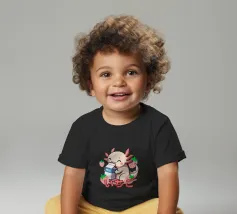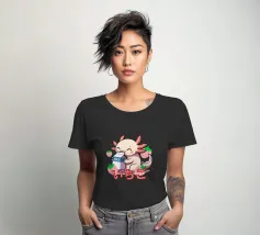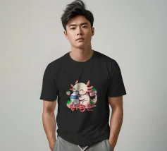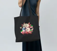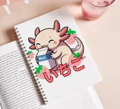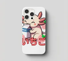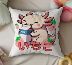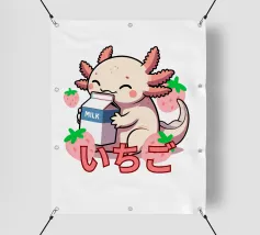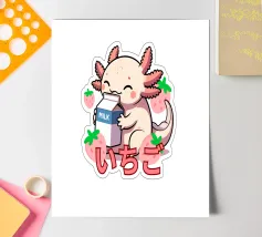 Un simpatico axolotl tiene in mano un cartone del latte, circondato da fragole su uno sfondo solido. I caratteri giapponesi in basso aggiungono un tocco giocoso alla scena.