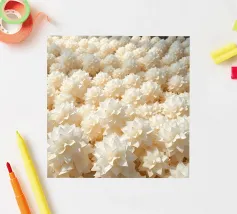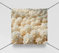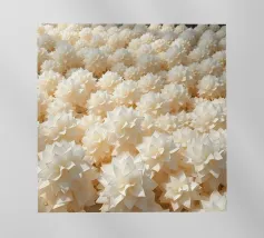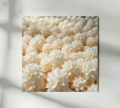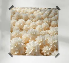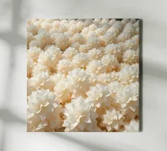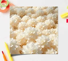 Questa splendida immagine cattura un sereno e intricato campo di fiori ritagliati in carta, che assomiglia a un mare di dalie bianche luminescenti. Ogni fiore è stato meticolosamente realizzato con più strati, creando un senso di profondità e delicata consistenza. Le morbide tonalità crema e bianco sporco, immerse in una luce delicata, evocano una sensazione di purezza, tranquillità e raffinata eleganza. Questo pezzo è perfetto per chi apprezza l'artigianato dettagliato e un'estetica pulita e minimalista. Sarebbe una splendida aggiunta a un arredamento moderno, scandinavo o shabby chic, aggiungendo un tocco di sofisticata arte floreale a qualsiasi spa.