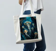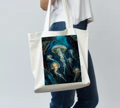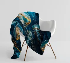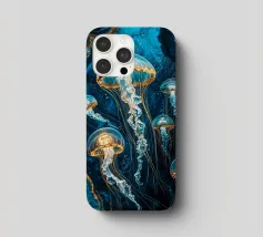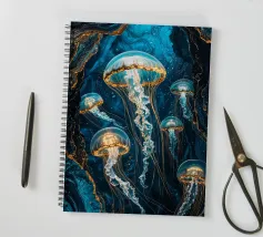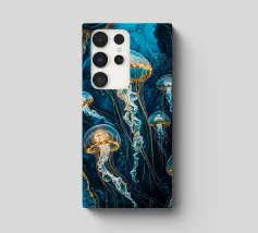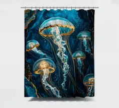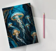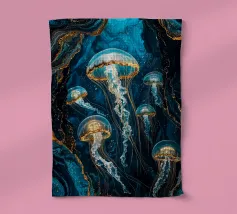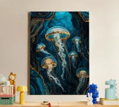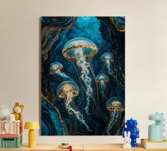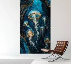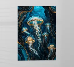 In un regno sottomarino di zaffiro e oro, meduse luminose si muovono con grazia. Le loro forme delicate brillano con accenti dorati, una danza celestiale di luce e serenità nelle profondità dell'oceano.