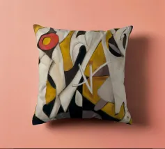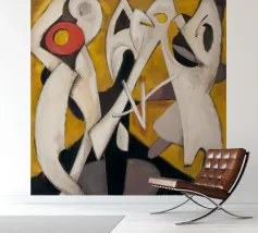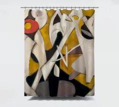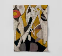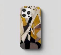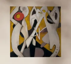 Dinamiche forme astratte in bianco e giallo si scontrano e si abbracciano in una coreografia frastagliata e ritmica.