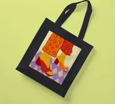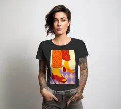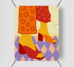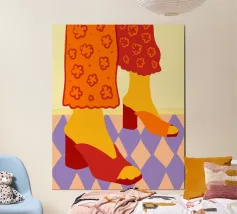 "Dancing Across Checkered Dreams" cattura il vibrante contrasto di piedi gialli con tacchi rossi, ornati da audaci pantaloni floreali, mentre camminano su un pavimento a scacchi bianchi e neri. Questa composizione giocosa fonde colori vivaci e motivi geometrici, creando un'immagine dinamica e accattivante.