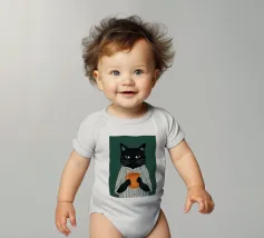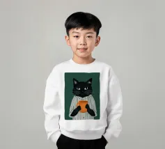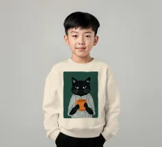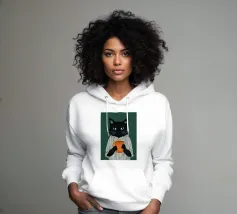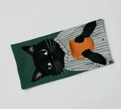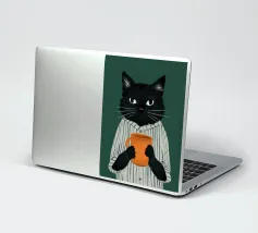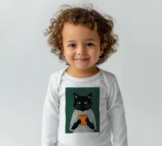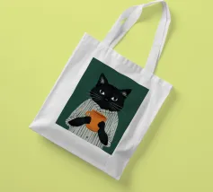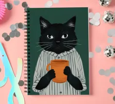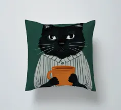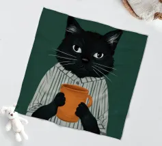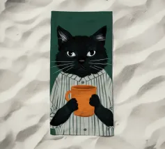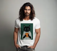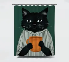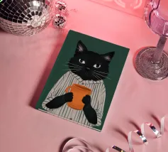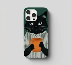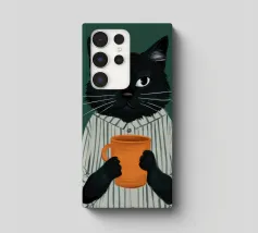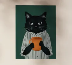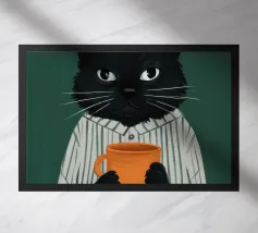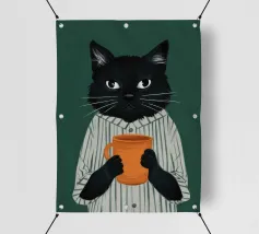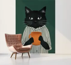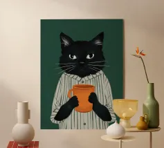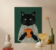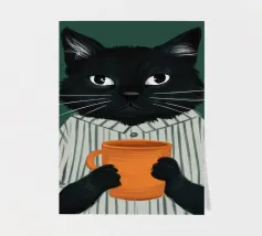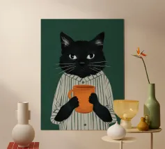 Un'illustrazione affascinante e stravagante di un elegante gatto nero che indossa una camicia a righe e tiene in mano un piccolo vaso di terracotta. Questa opera d'arte antropomorfa è piena di carattere e di fascino eccentrico.
