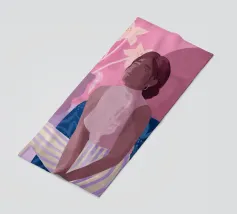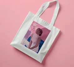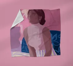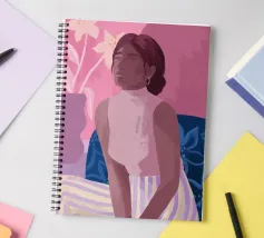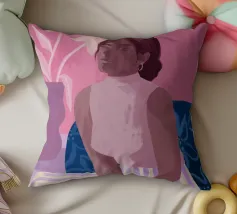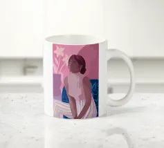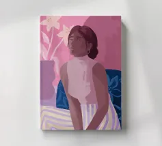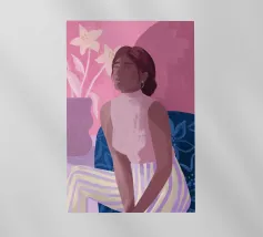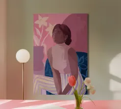 Daydreaming è un'illustrazione di una donna che sogna ad occhi aperti su una sedia blu a stampa floreale. È dipinta in modo giocoso con tratti sciolti. L'illustrazione presenta una tavolozza di colori rosa e viola. Sullo sfondo è presente un vaso moderno con gigli.