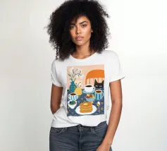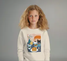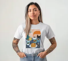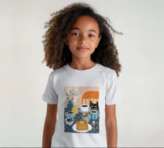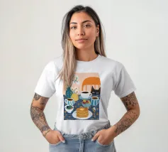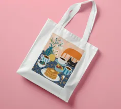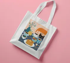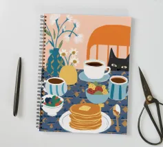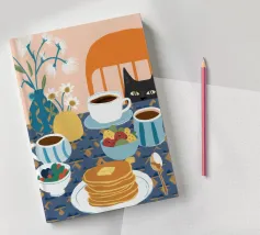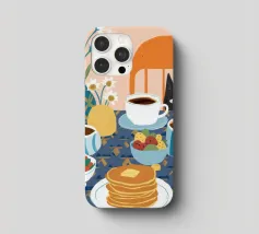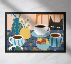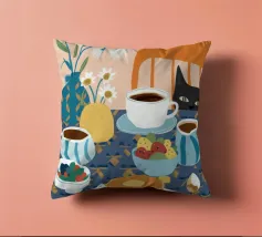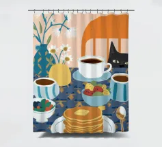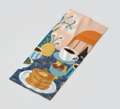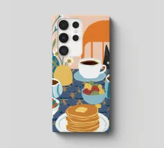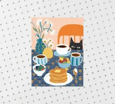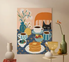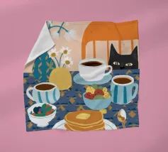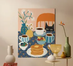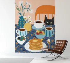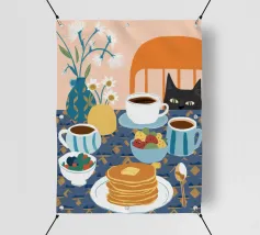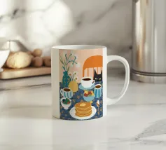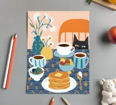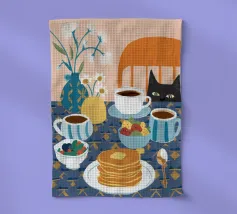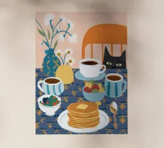 Un'accogliente scena di colazione presenta una pila di pancake, tazze di caffè e una statuetta di gatto su un tavolo blu, creando un'atmosfera mattutina calda, invitante e leggermente stravagante.