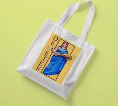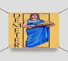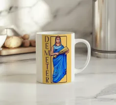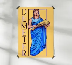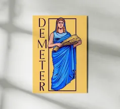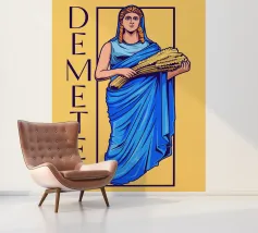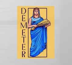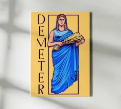 Demetra è raffigurata in una posa classica con un fascio di grano tra le braccia, simbolo di fertilità e agricoltura. Il suo sguardo calmo e il colore blu della veste trasmettono cura e vicinanza alla natura.