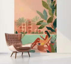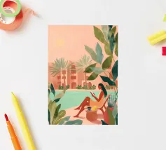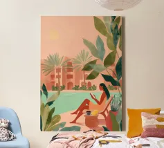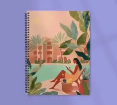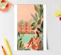 Nella calma dorata di un'oasi nel deserto, una donna siede a bordo piscina, immersa nel suo libro, incorniciata da un'abbondante vegetazione e da un'architettura tranquilla. La calda tavolozza di terracotta e il sole gentile evocano quiete e solitudine, mentre la scena sussurra di mattinate lente e pomeriggi senza tempo. Con un caffè, limoni e la quiete come unica compagnia, l'autrice diventa un ritratto della pace interiore, un momento sospeso tra i capitoli, sia letterari che personali.