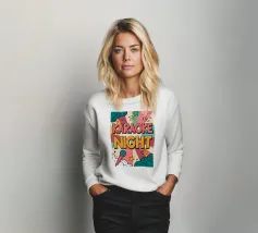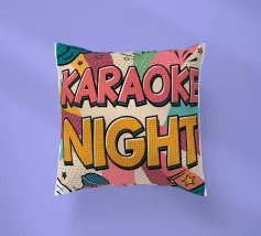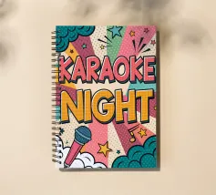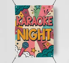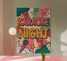 Audace design pop art retrò con un vivace tema "Karaoke Night" con un microfono ed elementi colorati in stile fumetto.