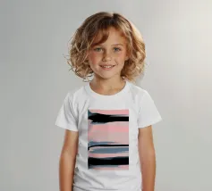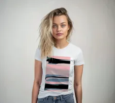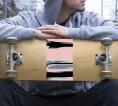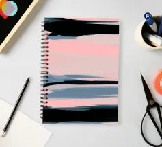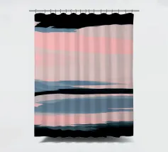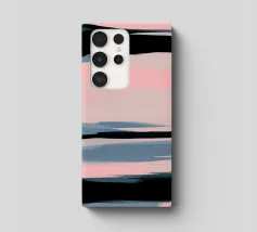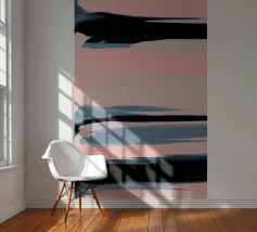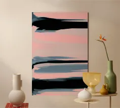 Arte astratta elegante e minimale con pennellate decise e movimento di colore in nero, grigio-blu e pesca sfumato.