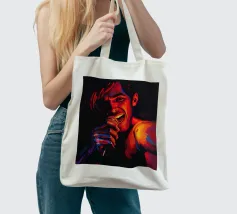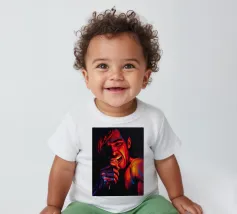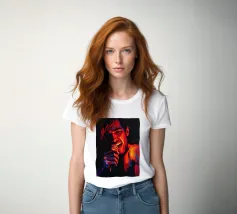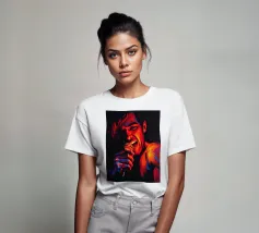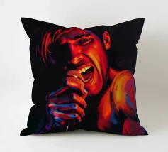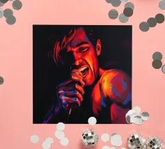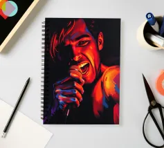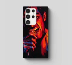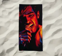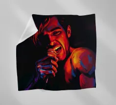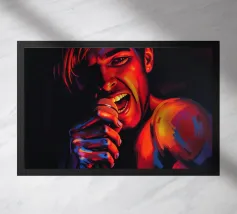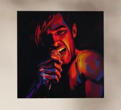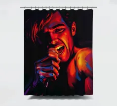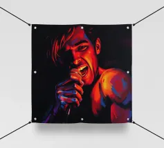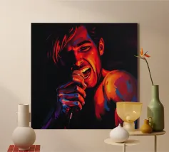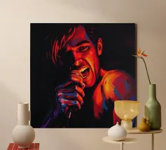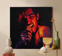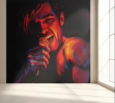 Una rappresentazione dinamica e colorata di un cantante maschile che canta appassionatamente in un microfono. L'intensa illuminazione del palco mette in risalto i suoi tratti espressivi e il suo fisico muscoloso.
