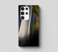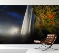 Fotografia notturna dietro la cascata Seljalandsfoss in Islanda.