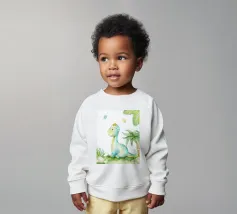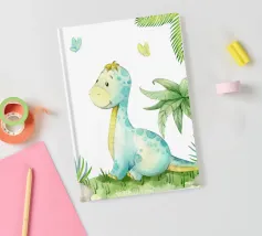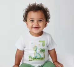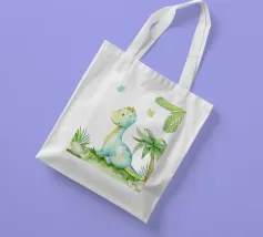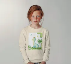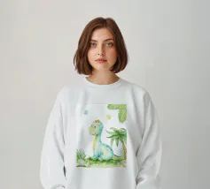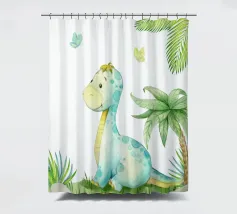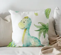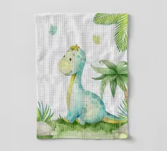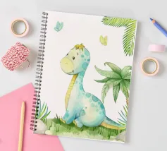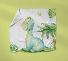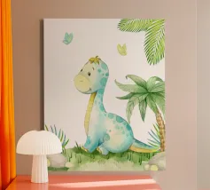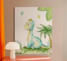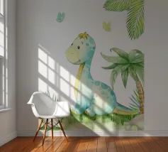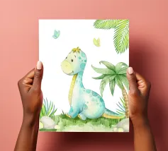 Un simpatico dinosauro blu con pelle maculata siede allegramente su uno sfondo lussureggiante con palme e farfalle. L'ambientazione è luminosa e giocosa e fonde elementi della natura con uno stile stravagante e cartoonesco.