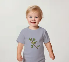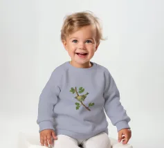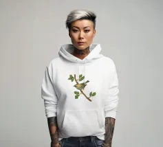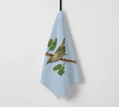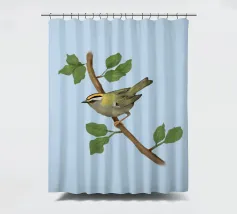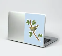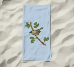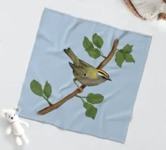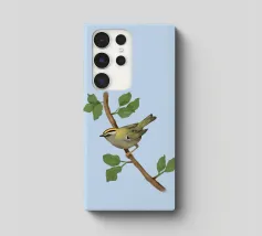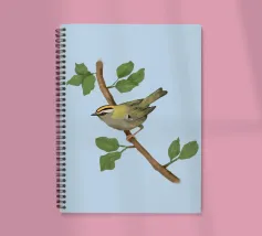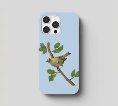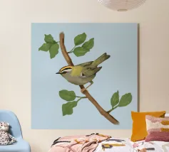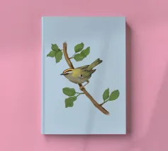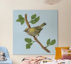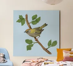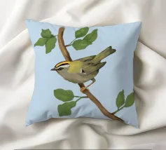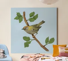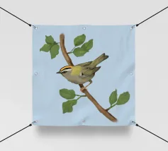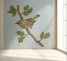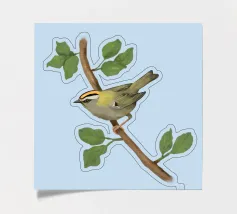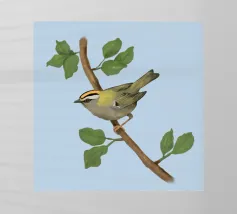 Disegno di una cresta di fuoco comune. L'uccellino è seduto su un ramo diagonale con foglie verdi. L'uccello si vede un po' dall'alto, in modo da poterne osservare bene il dorso.