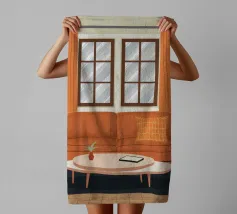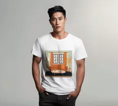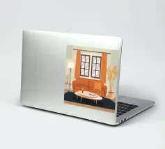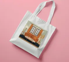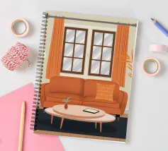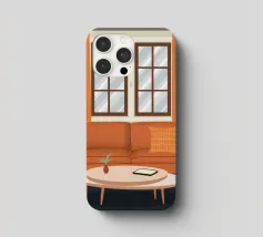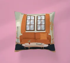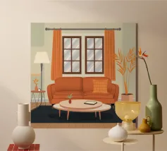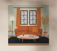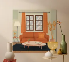 Illustrazione di un bel soggiorno illuminato dal sole con un comodo divano arancione, un tavolino e delle piante. La luce calda che filtra dalla finestra crea un'atmosfera serena, tranquilla e invitante.