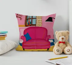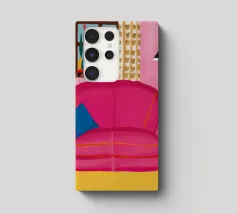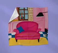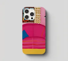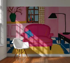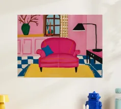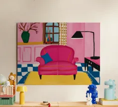 Un interno moderno con un elegante divano rosa su un pavimento a scacchi bianchi e neri. Una lampada da terra nera e una semplice pianta aggiungono un'estetica chic, grafica e contemporanea.