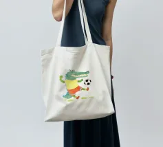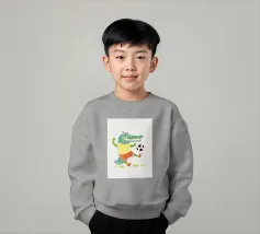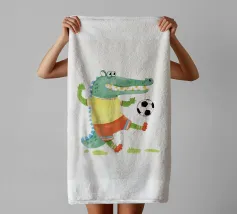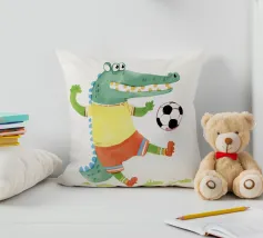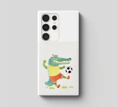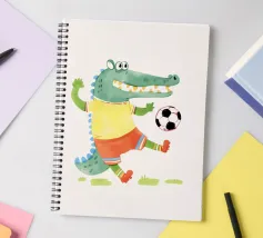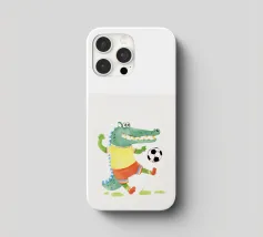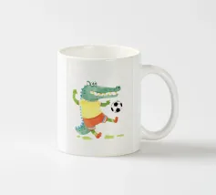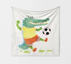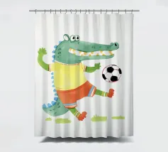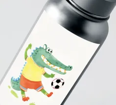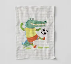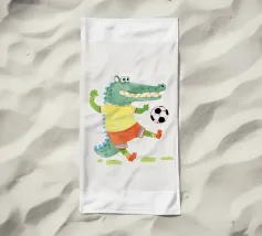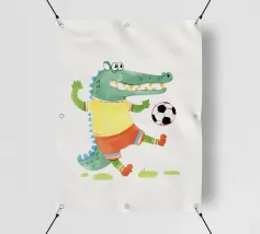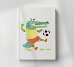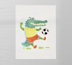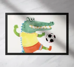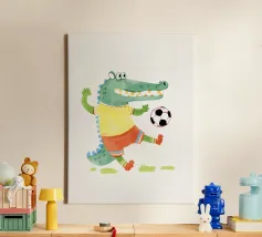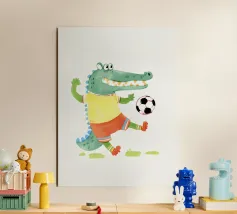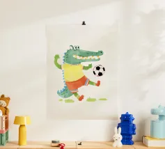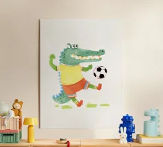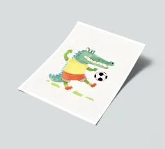 Un simpatico coccodrillo verde con pantaloncini rossi e maglia gialla calcia allegramente un pallone. Questo disegno ad acquerello minimalista e umoristico porta allegria e divertimento nella stanza dei bambini e celebra lo sport con un tocco di simpatia!