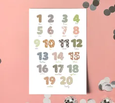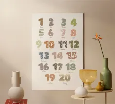 Questo disegno giocoso e artistico presenta i numeri da 1 a 20 in uno stile stravagante e strutturato. Ogni numero è caratterizzato da una fantasia unica con punti, strisce ed elementi astratti che rendono l'apprendimento o il conteggio divertente e visivamente accattivante. I toni tenui e terrosi e la varietà di texture piacciono a grandi e piccini, rendendo questo disegno perfetto per magliette per bambini, decorazioni per la cameretta, poster e prodotti educativi. È ideale per gli spazi di apprendimento precoce o per la moda e la cartoleria.