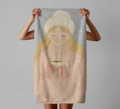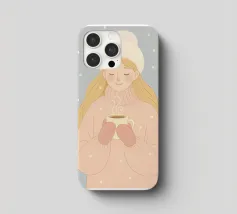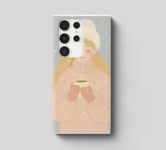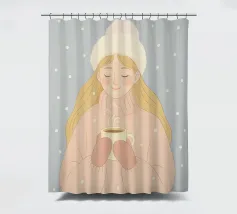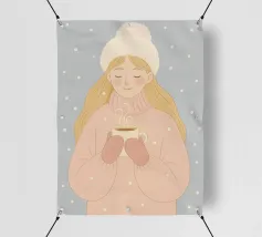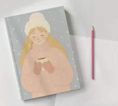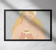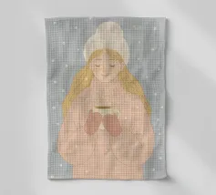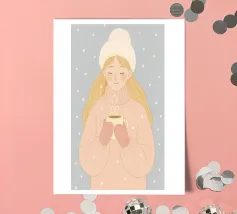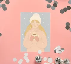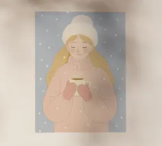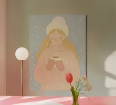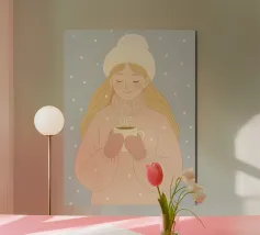 Un'accogliente scena invernale natalizia di una ragazza con un morbido maglione rosa e guanti abbinati. Indossa un cappello rosa chiaro e soffice, mentre tiene in mano una tazza di cioccolata calda, circondata da fiocchi di neve che cadono. Questa illustrazione natalizia evoca sentimenti di calore, pace e semplici gioie durante l'inverno.