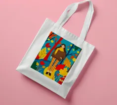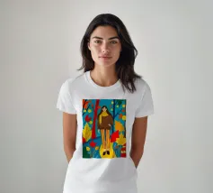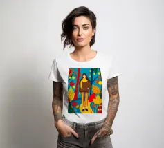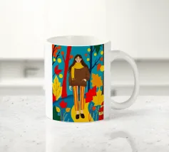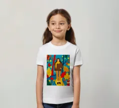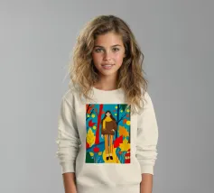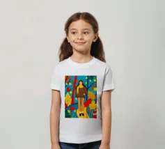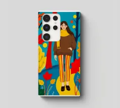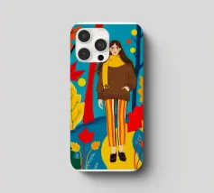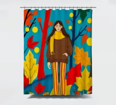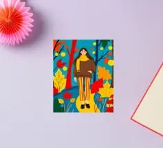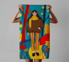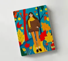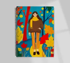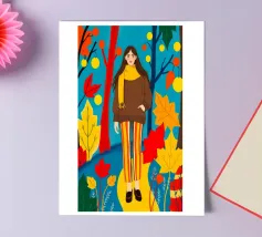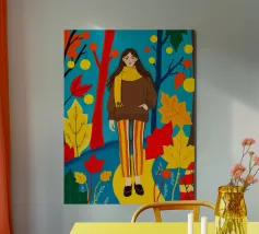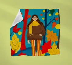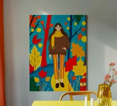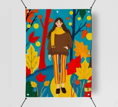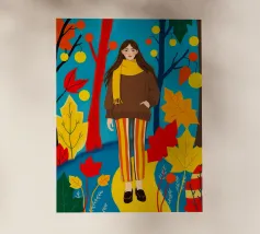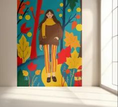 Una scena autunnale con una giovane donna che cammina lungo un sentiero che attraversa una colorata foresta autunnale. Lo sfondo è di un vivace azzurro cielo, che crea un contrasto deciso con le tonalità calde delle foglie e del fogliame autunnale. La donna indossa uno spesso maglione marrone, una sciarpa giallo senape avvolta attorno al collo e pantaloni a righe verticali arancioni, gialle e bianche che riprendono le tonalità autunnali circostanti.