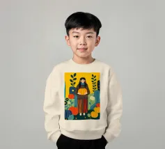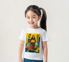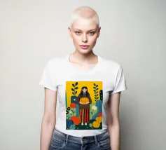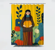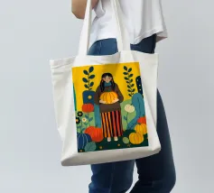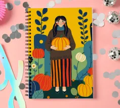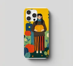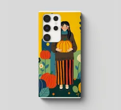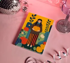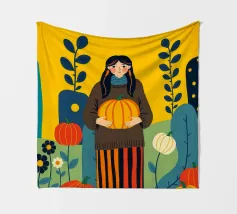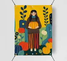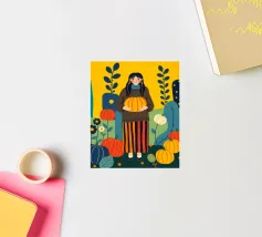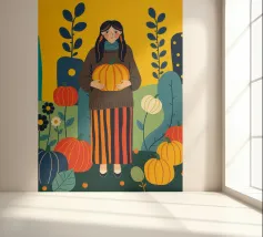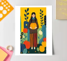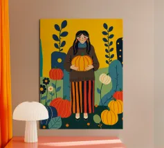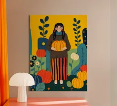Illustrazione di una giovane donna che raccoglie e tiene in mano una zucca in un campo di zucche. È ricca di colori caldi e autunnali - arancioni profondi, blu ricchi, verdi scuri e giallo oro - che evocano la sensazione dell'autunno o della stagione del raccolto. Cattura anche una scena autunnale piena di calma, natura e tradizione associata al raccolto, al ringraziamento e al ciclo di crescita e cambiamento.