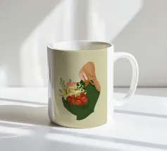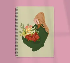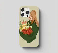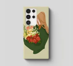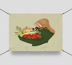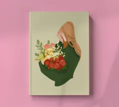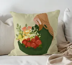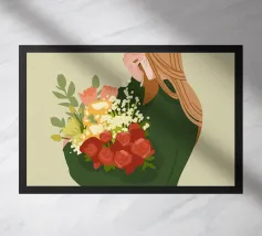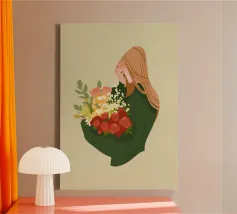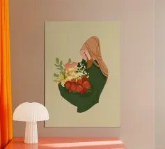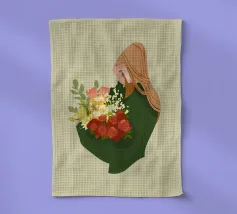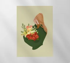 donna con in mano dei fiori bouquet capelli biondi rose fiori rossi fiori gialli foglie verdi floreale braccia incrociate capelli lunghi sfondo astratto composizione floreale avvolto in un panno verde illustrazione stilizzata petali delicati verde colori pastello figura singola volto nascosto