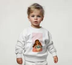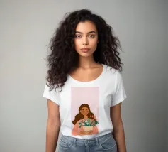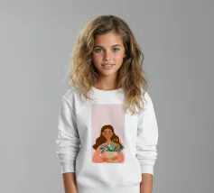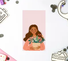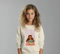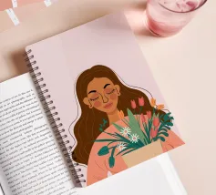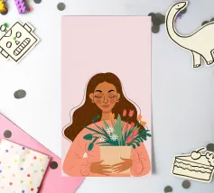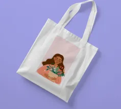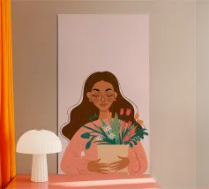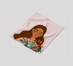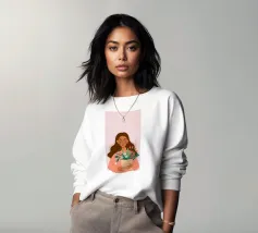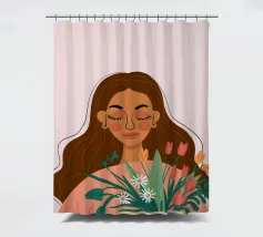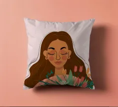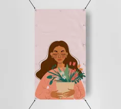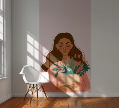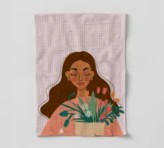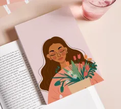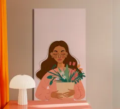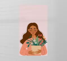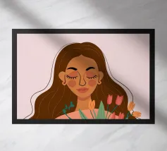 Ritratto di una donna con gli occhi chiusi, che tiene teneramente in mano un grande mazzo di fiori colorati. La scena è una rappresentazione bella, serena e commovente di un amore profondo e di un legame con la bellezza della natura.