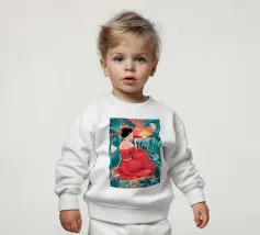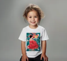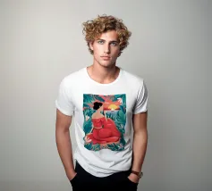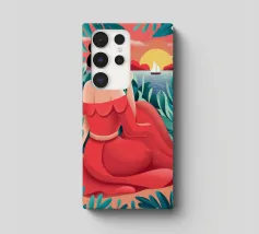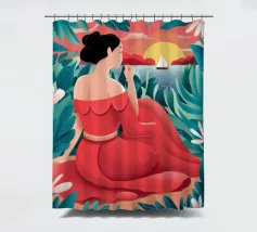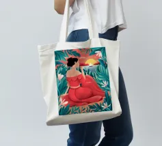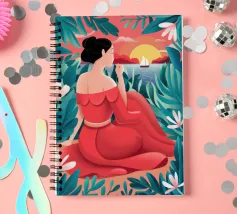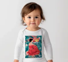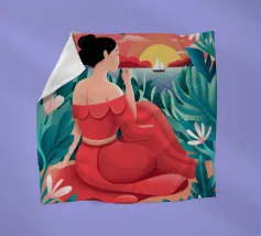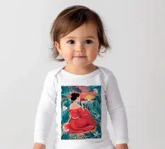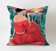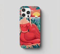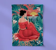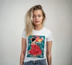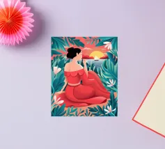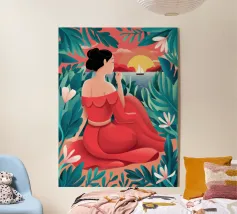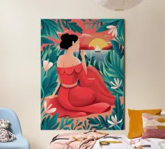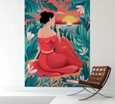 Illustrazione di una donna in un vivace abito rosso, seduta con grazia tra lussureggianti foglie tropicali di grandi dimensioni. La scena è elegante, serena ed esotica.