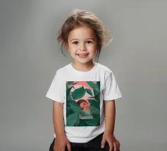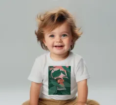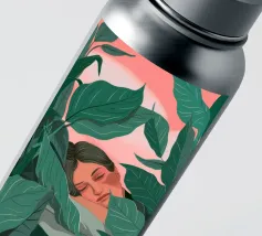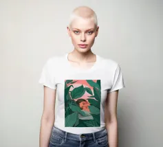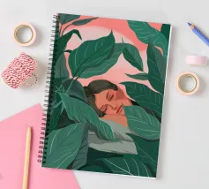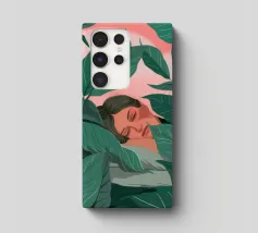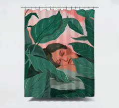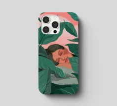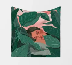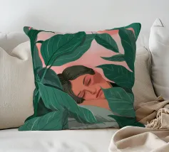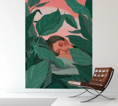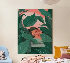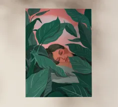 Una serena illustrazione di una persona che dorme pacificamente, avvolta da grandi e rigogliose foglie della giungla. La scena è una rappresentazione bella, intima e tranquilla di una profonda connessione con la natura e di un sonno ristoratore.