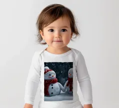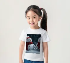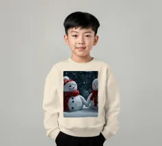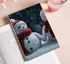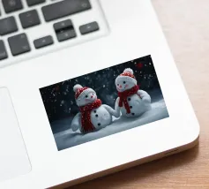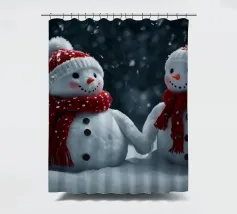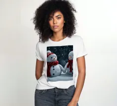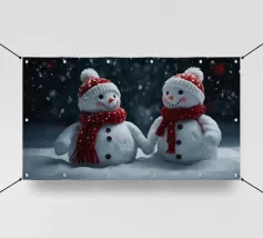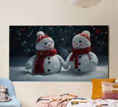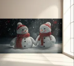 I due pupazzi di neve sono mano nella mano e mostrano le loro espressioni amichevoli. Ognuno di loro è adornato con un cappello e una sciarpa, circondato da fiocchi di neve che cadono sotto il cielo notturno invernale.