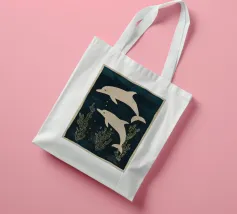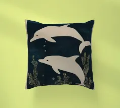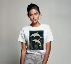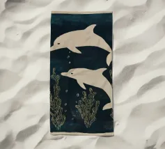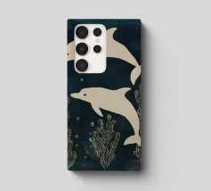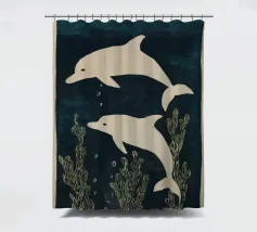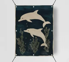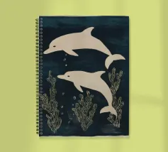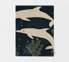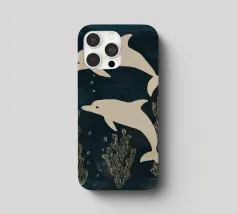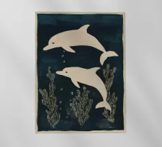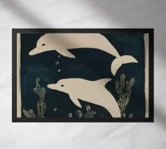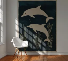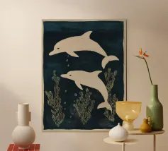 Due delfini che nuotano in acque blu profonde con morbide piante marine intorno a loro. I toni delicati e il movimento calmo creano una scena pacifica.