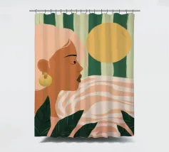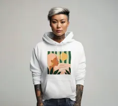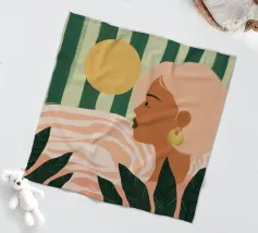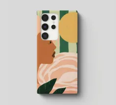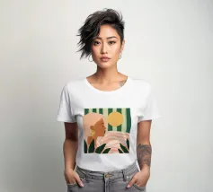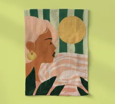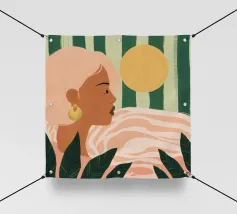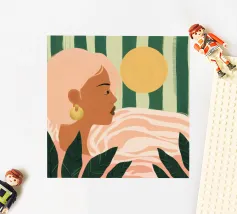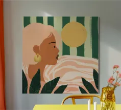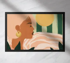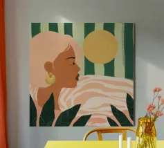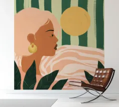 Un bellissimo ritratto stilizzato di due volti di donna di profilo, leggermente sovrapposti. I colori caldi e tenui e lo sfondo a righe creano un'opera d'arte delicata e intima che parla di legami e identità.