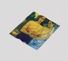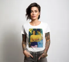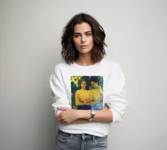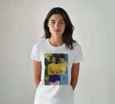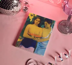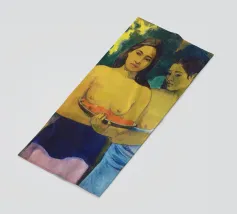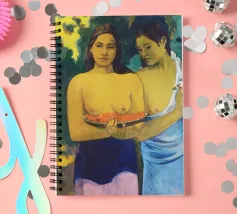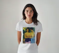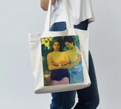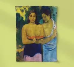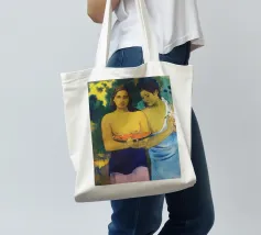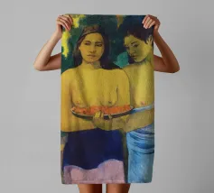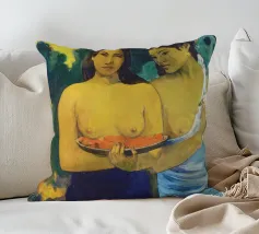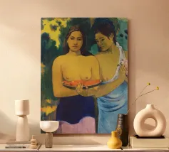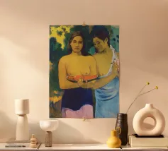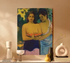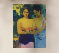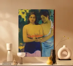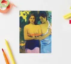 Dipinto durante il periodo trascorso nella Polinesia francese, Due donne tahitiane è una delle opere più iconiche di Paul Gauguin. La composizione presenta due donne serene che offrono frutta tropicale, fondendo una natura morta simbolica con uno stile audace e appiattito influenzato dall'arte non occidentale Paul Gauguin, Due donne tahitiane, dipinto del 1899, post-impressionismo, Polinesia francese, periodo di Gauguin a Tahiti, esotismo nell'arte, stile primitivo, pittura simbolica, opere d'arte famose, ritratto di Gauguin, rappresentazione culturale, arte tropicale, storia dell'arte, donne nell'arte, pittura a olio, maestro modernista, arte del XIX secolo, colori vivaci, ancora