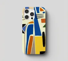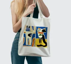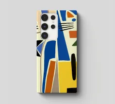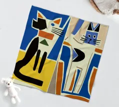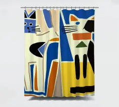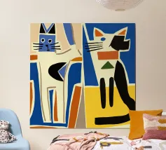 Una rappresentazione colorata e astratta di gatti è raffigurata con blocchi di colore e forme geometriche. I gatti sono stilizzati con caratteristiche esagerate, come occhi grandi e baffi prominenti, su uno sfondo di colore blu e giallo brillante.
