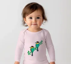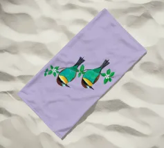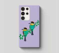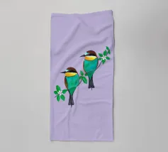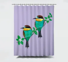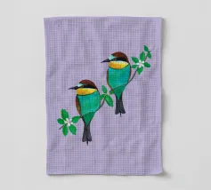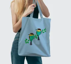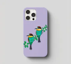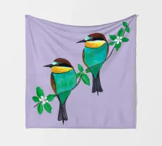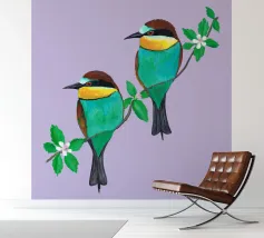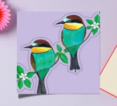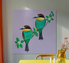 Un dipinto ad inchiostro acrilico raffigurante due gruccioni seduti su un ramo con foglie e fiori rosa. Sono in posizione rilassata ed entrambi guardano a sinistra.