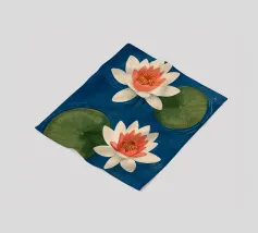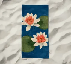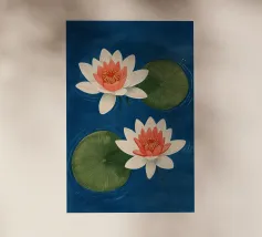 L'immagine mostra due eleganti fiori di ninfea con petali esterni bianchi e interni arancioni, accompagnati da foglie verdi e rotonde di ninfea su una superficie d'acqua scura. Lo sfondo scuro mette in risalto i colori vivaci dei fiori e delle foglie. Stilisticamente, l'illustrazione è dettagliata e ricca di texture, con un'attenzione particolare ai contrasti di colore e alle forme morbide e naturali. Un gioco estetico di calma e intensità cromatica.