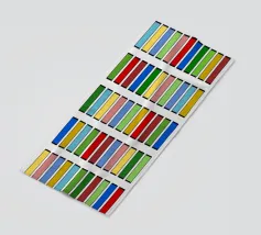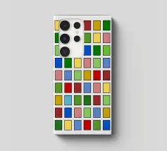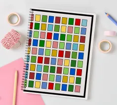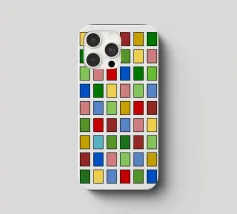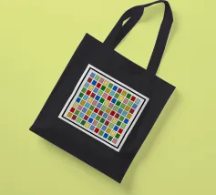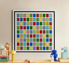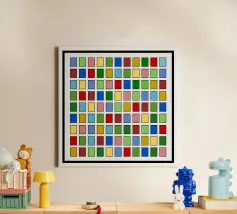 Questo quadro astratto geometrico presenta un preciso schema a griglia di 10x10 piccoli quadrati. Ogni quadrato è riempito con un colore diverso e brillante, tra cui rosso, blu, giallo, varie tonalità di verde, rosa e marrone. I colori sono disposti in modo casuale, creando un mosaico vivace e colorato. I singoli campi di colore sono incorniciati da sottili linee scure e poggiano su uno sfondo grigio chiaro. La composizione ricorda l'arte seriale o la pittura a campi di colore, ma è molto vivace grazie alla struttura in scala ridotta.
