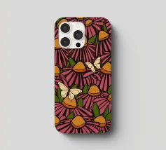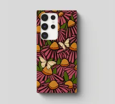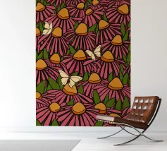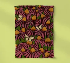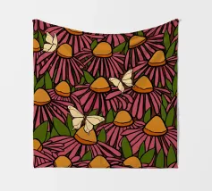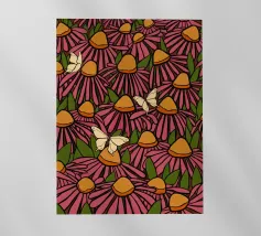 Una nostalgica illustrazione digitale a olio di un campo di fiori di echinacea con tre graziose farfalle bianche. Creata in stile retrò con toni lunatici e contorni neri decisi, che richiamano il fascino dei fumetti d'epoca.