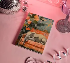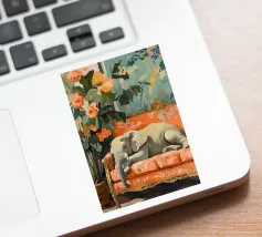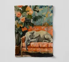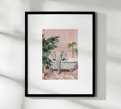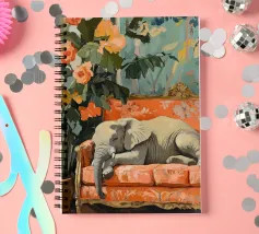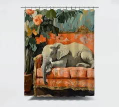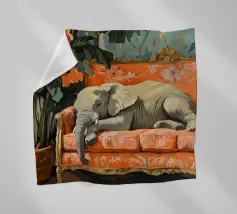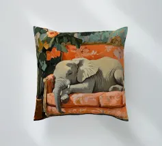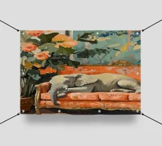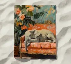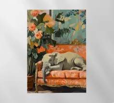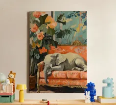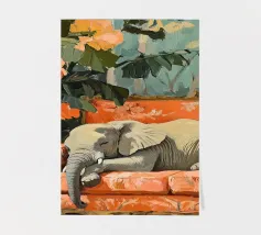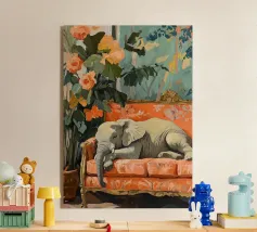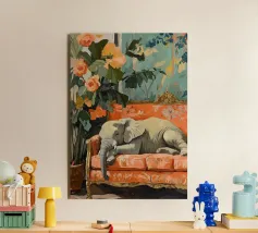 Un elefante che dorme su un divano ornato color pesca e corallo, circondato da piante verdi con fiori arancioni sullo sfondo, dipinto con colori pastello tenui. Il dipinto ha uno stile vintage e ricorda il design d'interni del primo Novecento. Secolo. Ha un aspetto antico, come se fosse stato dipinto per il salotto di una persona.