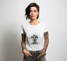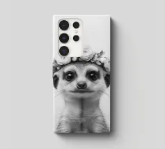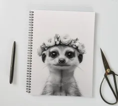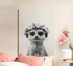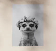 Il ritratto di un simpatico suricato con una corona di fiori cattura il suo carattere giocoso in bianco e nero ed è perfetto per gli amanti degli animali. Gli occhi espressivi e la pelliccia aggiungono un tocco affascinante all'illustrazione.
