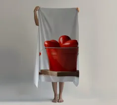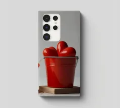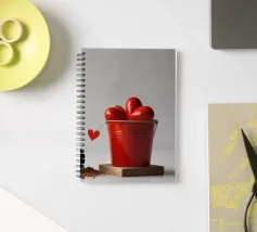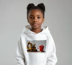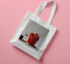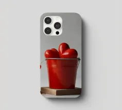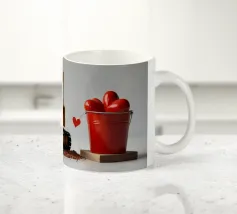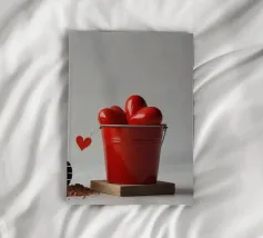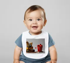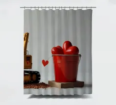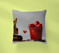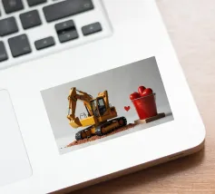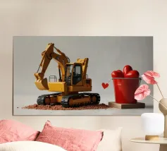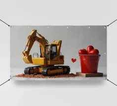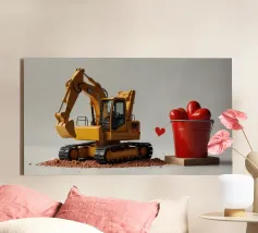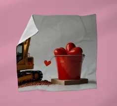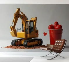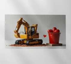 Un escavatore giallo è posizionato accanto a una benna rossa piena di oggetti a forma di cuore, che simboleggiano l'amore. L'ambientazione è caratterizzata da un terreno soffice, che aggiunge un tocco unico al tema di San Valentino.