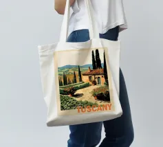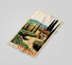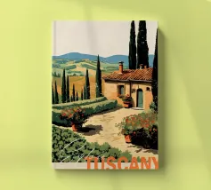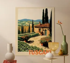Questo poster in stile retrò mette in risalto l'incantevole bellezza della Toscana, con dolci colline, cipressi e un caldo cielo dorato. Il testo in grassetto, "Explore TUSCANY", invita all'avventura, mescolando texture vintage e toni della terra. Perfetto per ispirare i viaggi o come decorazione per gli amanti della natura e della cultura.
