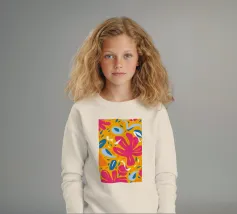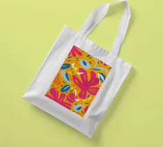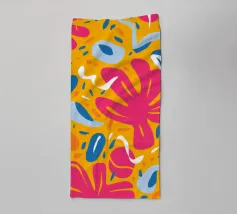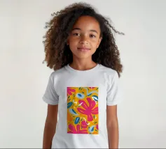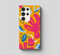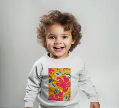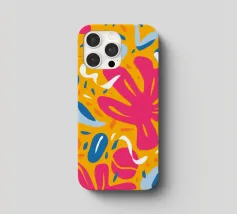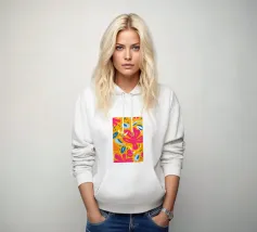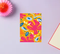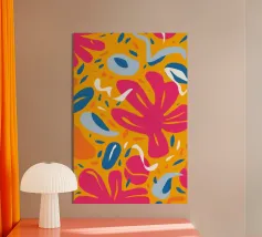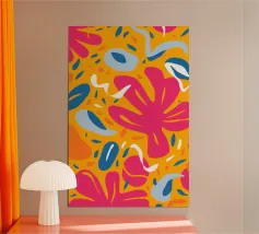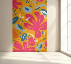 Un'opera astratta vibrante ed energica, piena di forme giocose e sovrapposte in rosa caldo, giallo e arancione, che evoca una sensazione di pura gioia, celebrazione e abbandono creativo.