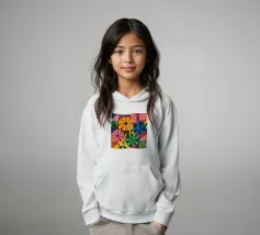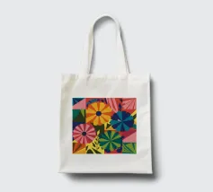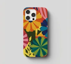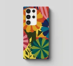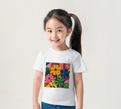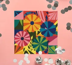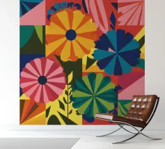 Un'esplosione di fiori viene reimmaginata attraverso una lente geometrica, con petali e foglie che formano un bellissimo motivo simmetrico e colorato che ricorda un caleidoscopio.